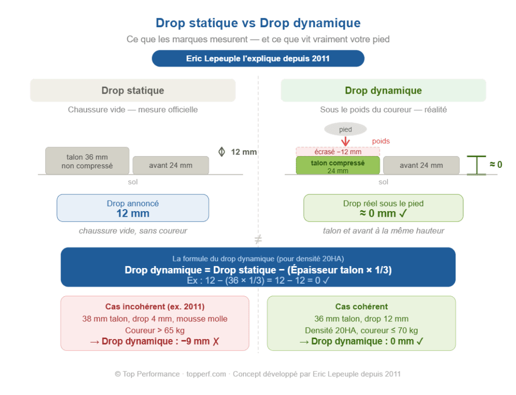 La formule du drop dynamique Drop dynamique = Drop statique − (Épaisseur talon × 1/3) Exemple : 12 mm − (36 mm × 1/3) = 12 − 12 = 0 mm ✓